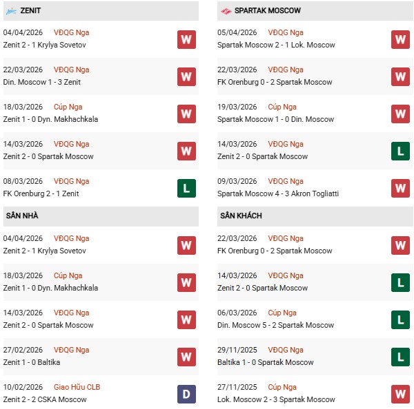 Thành tích đối đầu Zenit vs Spartak Moscow: