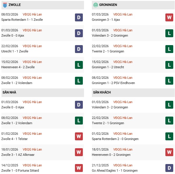 Màn trình diễn sân khách của Groningen từ đầu Eredivisie 2025/26 cũng chỉ ở mức trung bình thấp khi mà số trận thua (7) đang nhiều hơn số thắng lợi (5) sau 13 trận. Trong khi đó, Zwolle thua đúng 1/8 trận sân nhà vừa qua tại giải VĐQG Hà Lan (thậm chí thắng 5) và thất bại đó còn có phần đáng tiếc khi họ để các vị khách Volendam chọc thủng lưới vào khoảng thời gian bù giờ của hiệp 2.