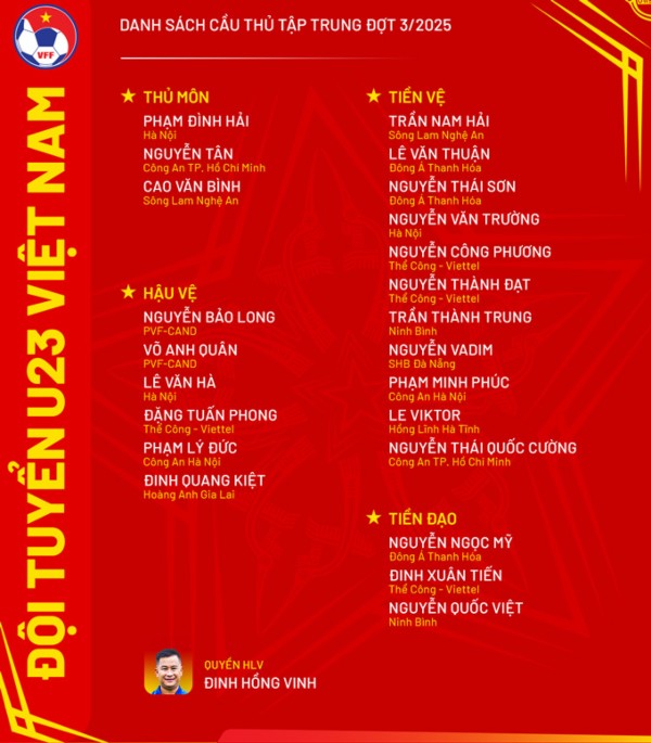 Trong danh sách tập trung đợt 3/2025, ngoại trừ một số cầu thủ xuất sắc được triệu tập vào đội tuyển quốc gia thi đấu Vòng loại Asian Cup 2027, nhiều gương mặt đáng chú ý tiếp tục góp mặt như Phạm Lý Đức, Lê Văn Thuận, Nguyễn Văn Trường, Nguyễn Ngọc Mỹ – những cầu thủ từng để lại dấu ấn trong hành trình vòng loại U23 châu Á vừa qua.