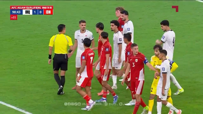 Hành động của Indonesia khiến họ bị trọng tài Ma Ning rút thẻ đỏ. Hình ảnh truyền hình cho thấy trọng tài này rút 3 thẻ đỏ với các thành viên bên phía Indonesia. Đầu tiên, Ma Ning rút thẻ đỏ với Shayne Pattynama. Hậu vệ này sấn sổ lao về phía trọng tài và được HLV Graham Arnold của Iraq can ngăn. Trưởng đoàn Surmadji tiến tới xô mạnh Ma Ning với gương mặt đằng đằng sát khí, để rồi cũng phải nhận thẻ đỏ. Sau đó trọng tài 46 tuổi đưa ra hình phạt tương tự với Thom Haye. Tiền vệ này cũng nổi nóng trước khi được trung vệ đội trưởng Jay Idzes ôm lấy và khuyên can.